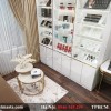 Khu vực trưng bày sản phẩm sử dụng hệ tủ trưng bày sát tường thiết kế đơn giản màu trắng. Tủ kính trắng cao sát trần nhà tận dụng nhiều không gian để trưng bày sản phẩm.