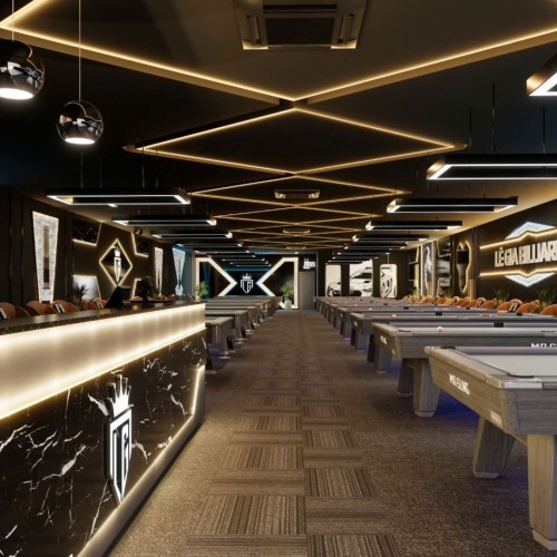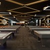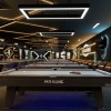 Hệ thống đèn trần thả với chụp bóng kim loại bóng bẩy kết hợp cùng trần nhà thiết kế theo dạng hình học độc đáo. Khu vực này vừa là nơi phục vụ đồ uống, vừa đóng vai trò là điểm nhấn thẩm mỹ của toàn bộ quán bida.