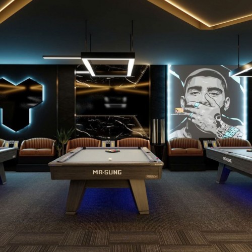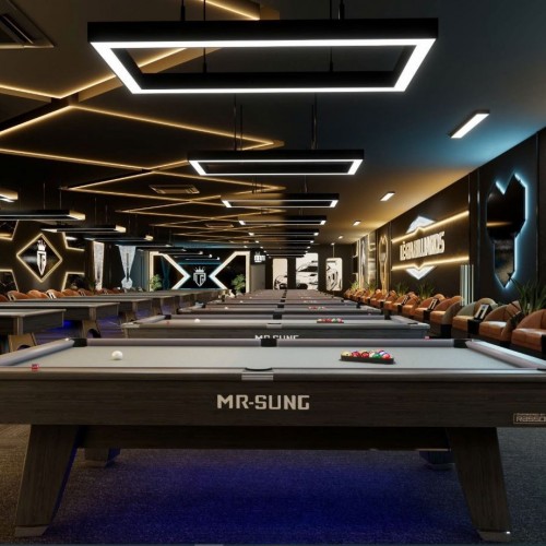 Chiếm phần lớn diện tích trong không gian quán là ba bàn bi-a chuyên nghiệp mang thương hiệu MR.SUNG. Hệ thống bàn được bố trí đối xứng tạo nên cảm giác cân bằng và thẩm mỹ. Đặc biệt, lối đi rộng rãi nên khách chơi dễ dàng khi thực hiện các thao tác đi bóng. Mỗi bàn được trang bị đầy đủ phụ kiện chất lượng cao, hệ thống ánh sáng treo hiện đại bên trên để người chơi có thể nhìn rõ đường bi mà không bị chói hoặc đổ bóng.