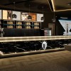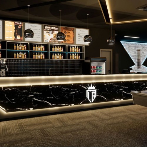 Không gian nội thất khu quầy bar trong thiết kế quán bida Lê Gia rất sang trọng,cao cấp. Quầy bar sử dụng chất liệu đá đen vân mây kết hợp hệ thống đèn LED âm tường chạy viền tạo hiệu ứng ánh sáng nổi bật. Chính giữa mặt quầy là logo thương hiệu Lê Gia nổi bật thể hiện sự chuyên nghiệp và cá tính riêng.