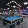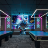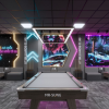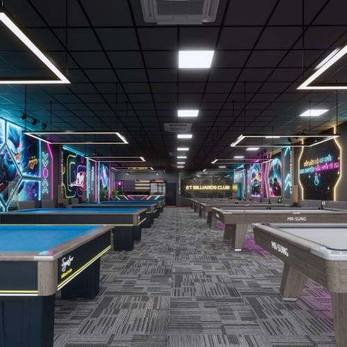 Bước vào bên trong thiết kế quán bida 2T Billiards Club, khách hàng được chào đón bởi một không gian đậm chất công nghệ. Từ ánh sáng neon phối màu thông minh đến cách bài trí các khu vực chức năng gọn gàng, khoa học. Quán sử dụng trần thạch cao phẳng sơn đen kết hợp đèn led panel âm trần đảm bảo độ sáng tổng thể. Bên cạnh đó là các đèn thả hình hộp vuông treo trên mỗi bàn bida giúp chiếu sáng tập trung giúp việc chơi bida chuẩn xác.