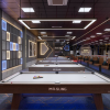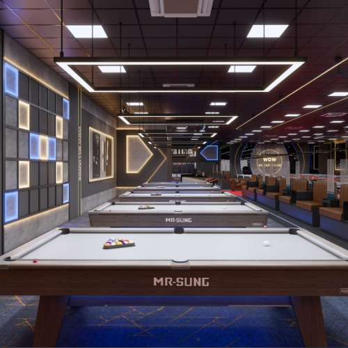 Thiết kế quán bida WOW Club trang bị hệ thống bàn bida tiêu chuẩn thi đấu từ các thương hiệu nổi tiếng như Mr. Sung và Athena. Mỗi bàn đều được bố trí với khoảng cách lý tưởng, đảm bảo không gian di chuyển thoải mái cho người chơi.