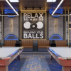 Ở giữa không gian chính là bức tường trung tâm nổi bật với dòng chữ “WOW BILLIARDS CLUB” khắc nổi ánh vàng, đặt giữa những mảng trang trí hình học đèn LED màu xanh lam. Sự kết hợp của bê tông trần với đèn LED tạo cảm giác mạnh mẽ, hiện đại nhưng vẫn giữ được sự tối giản tinh tế.