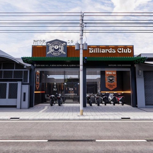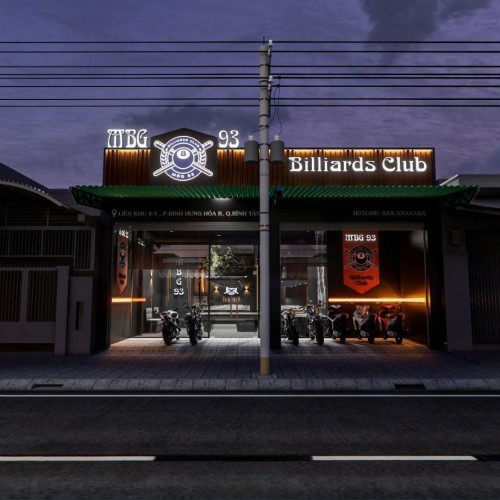 Mặt tiền quán bida MGB 93 gây ấn tượng mạnh với thiết kế hiện đại, cá tính và nổi bật giữa dãy phố. Biển hiệu được bố trí ở vị trí trung tâm, sử dụng tông màu cam, đen tương phản sang trọng và trẻ trung. Logo quán cùng tên gọi "MGB 93 Billiards Club" được đặt nổi bật ở chính giữa, sử dụng phông chữ hiện đại, dễ đọc và nổi bật về đêm nhờ hệ thống đèn LED chiếu sáng. Dòng địa chỉ và hotline được in rõ ràng hai bên, thuận tiện cho khách hàng liên hệ.
