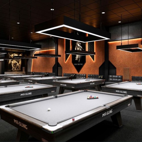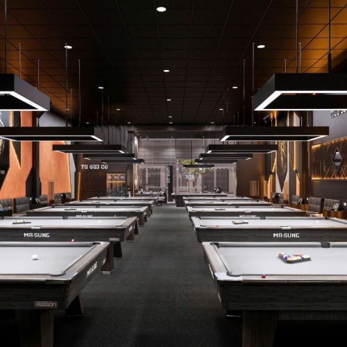 Không gian quán sử dụng hệ thống đèn treo hiện đại với thiết kế hình khối vuông tối giản, tích hợp đèn LED chiếu sáng tập trung cho từng bàn chơi. Ánh sáng trắng được điều chỉnh ở mức vừa phải, giúp người chơi nhìn rõ đường bóng, đồng thời không gây chói mắt hay tạo bóng đổ khó chịu.