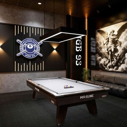 Trung tâm của thiết kế là các bàn bida thương hiệu MR.SUNG, được bố trí khoa học, mỗi bàn cách nhau khoảng cách tiêu chuẩn để người chơi không bị cản trở khi đánh. Bàn có kiểu dáng hiện đại, lớp nỉ màu xám sáng khác biệt so với màu xanh truyền thống, tạo sự mới lạ và nâng cao thẩm mỹ không gian.