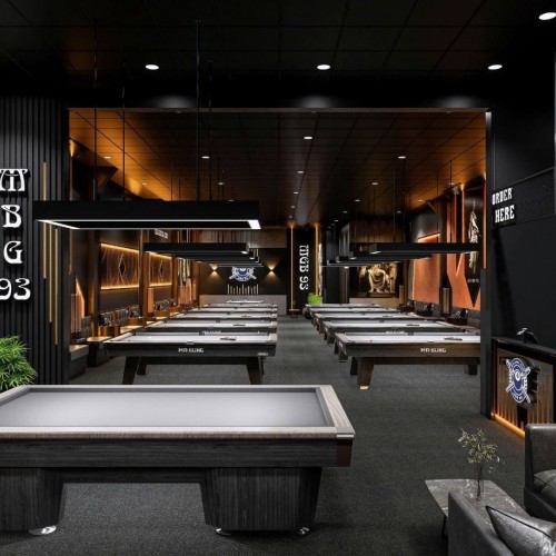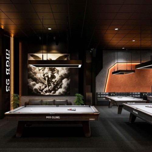 Ngay từ cái nhìn đầu tiên, không gian quán bida tạo cảm giác hài hòa, tinh tế và sang trọng. Thiết kế không gian được bố trí đối xứng, cân đối với dãy bàn bida trải dài hai bên, tạo nên cảm giác rộng rãi. Lối đi ở giữa được chừa đủ rộng để đảm bảo sự thoải mái khi di chuyển và thi đấu.