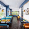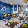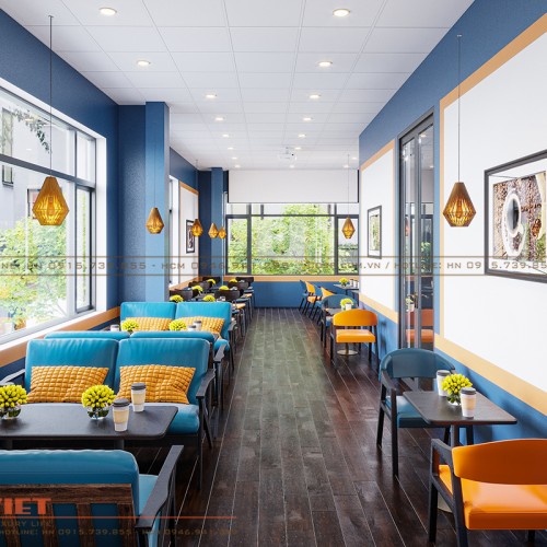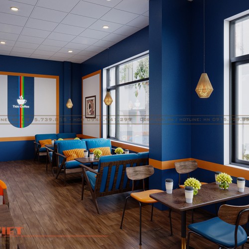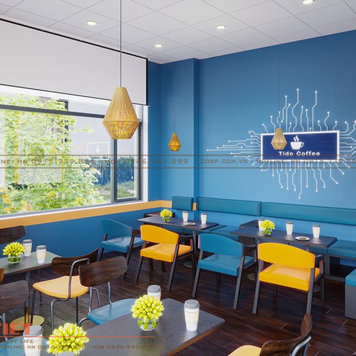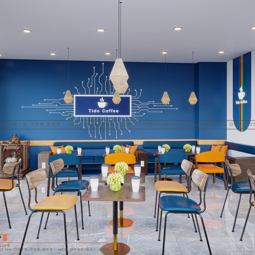 Tổng thể bố trí không gian hài hòa của đồ nội thất, hệ thống ánh sáng tự nhiên, ánh sáng nhân tạo tạo nên nét đặc trưng của quán TIDO. Gam màu xanh dương chủ đạo kết hợp thêm chút điểm nhấn màu trắng, vàng vừa sang trọng vừa hiện đại, trẻ trung. Hơn nữa, không thể thiếu được các bức tranh trang trí độc đáo, sinh động tạo điểm nhấn cho khu vực phục vụ khách này.