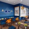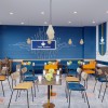 Đối diện với quầy pha chế chính là nơi khách hàng thưởng thức cafe khi đến với TIDO. PenViet sử dụng các mẫu ghế đơn làm từ khung gỗ tần bì phun màu sắc chỉ định kết hợp bọc da êm ái. Màu sắc của ghế đa dạng vô cùng trẻ trung và hiện đại. Trên bức tường màu xanh dương của quán là bộ chữ logo, tên thương hiệu ấn tượng thu hút khách hàng.