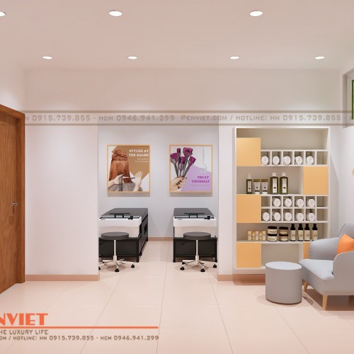 Nhằm mang đến cho khách hàng sự thoải mái và tiện nghi nhất khi trải nghiệm dịch vụ, Penviet đã tận dụng triệt để không gian bố trí ghế nail và đôn ngồi được bọc nỉ êm ái. Tủ đồ nail được tận dụng và dán decal màu cam nhạt mang đến hình ảnh không gian sang trọng cho thiết kế salon tóc.