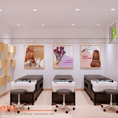 Không gian diện tích tiệm tóc được phân chia thành 2 khu vực chức năng. Với diện tích mặt bằng khá hạn chế nên nếu setup nội thất không gian rườm rà sẽ càng làm lộ các nhược điểm của không gian, tạo cảm giác chật chội, bí bách và kém chuyên nghiệp. Chính vì thế, Penviet đã tư vấn cho chủ đầu tư dự án lựa chọn thiết kế salon tóc mang phong cách hiện đại, chú trọng vào trang thiết bị nội thất cần thiết cho dịch vụ làm tóc, decor trang trí không gian để tạo điểm nhấn.