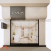 Phần bảng hiệu chính phía trên cửa ra vào được thiết kế theo dạng bo tròn mềm mại, tạo điểm nhấn uyển chuyển và thu hút. Logo chữ "JK SALON" cùng địa chỉ được in rõ nét bằng font chữ thanh mảnh, dễ đọc nhưng vẫn giữ được nét sang trọng. Việc sử dụng chữ trắng trên nền đen xám tạo sự tương phản nhẹ nhàng, không quá sắc nét nhưng vẫn đủ nổi bật.