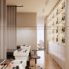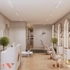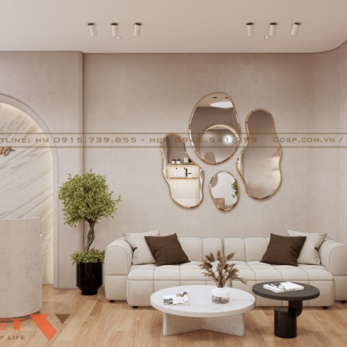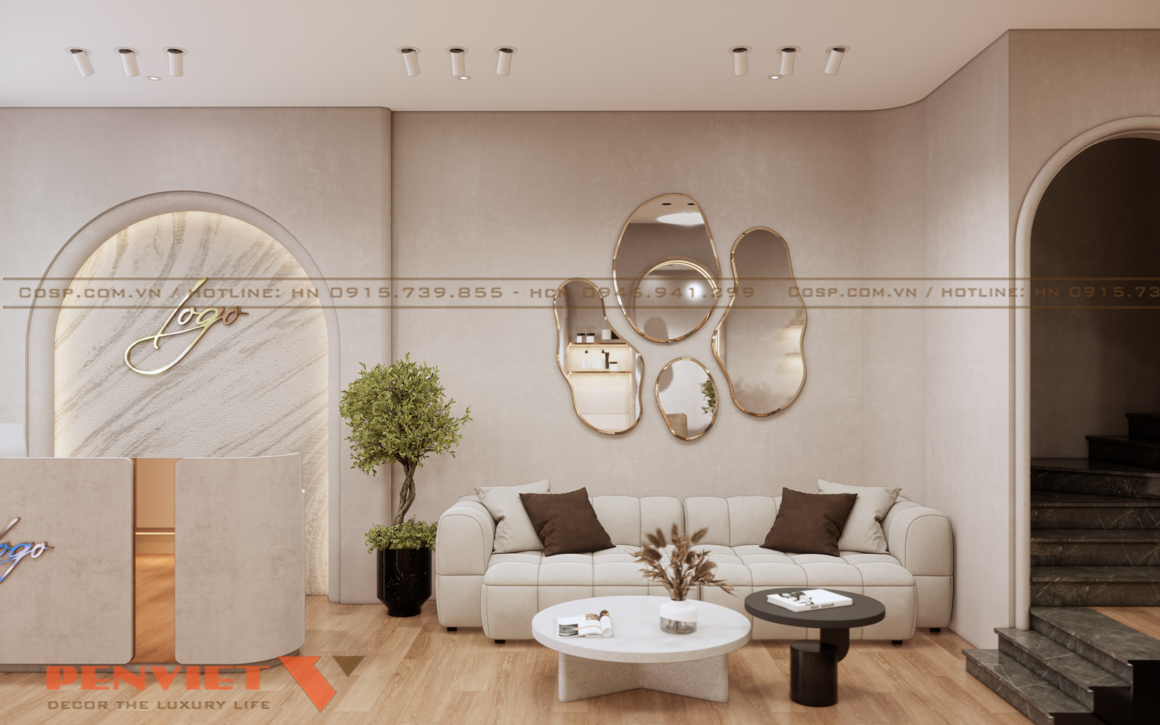 Phía sau quầy lễ tân, salon bố trí khu vực chờ tư vấn với bàn tròn thấp hiện đại và sofa đơn màu sáng. Không gian này được thiết kế mở nối liền với các khu vực dịch vụ phía sau, nhưng vẫn có sự ngăn cách tinh tế bằng bậc thềm chênh lệch độ cao tạo điểm phân chia mà không làm mất đi tính liên kết chung.