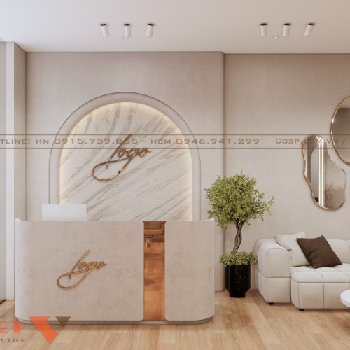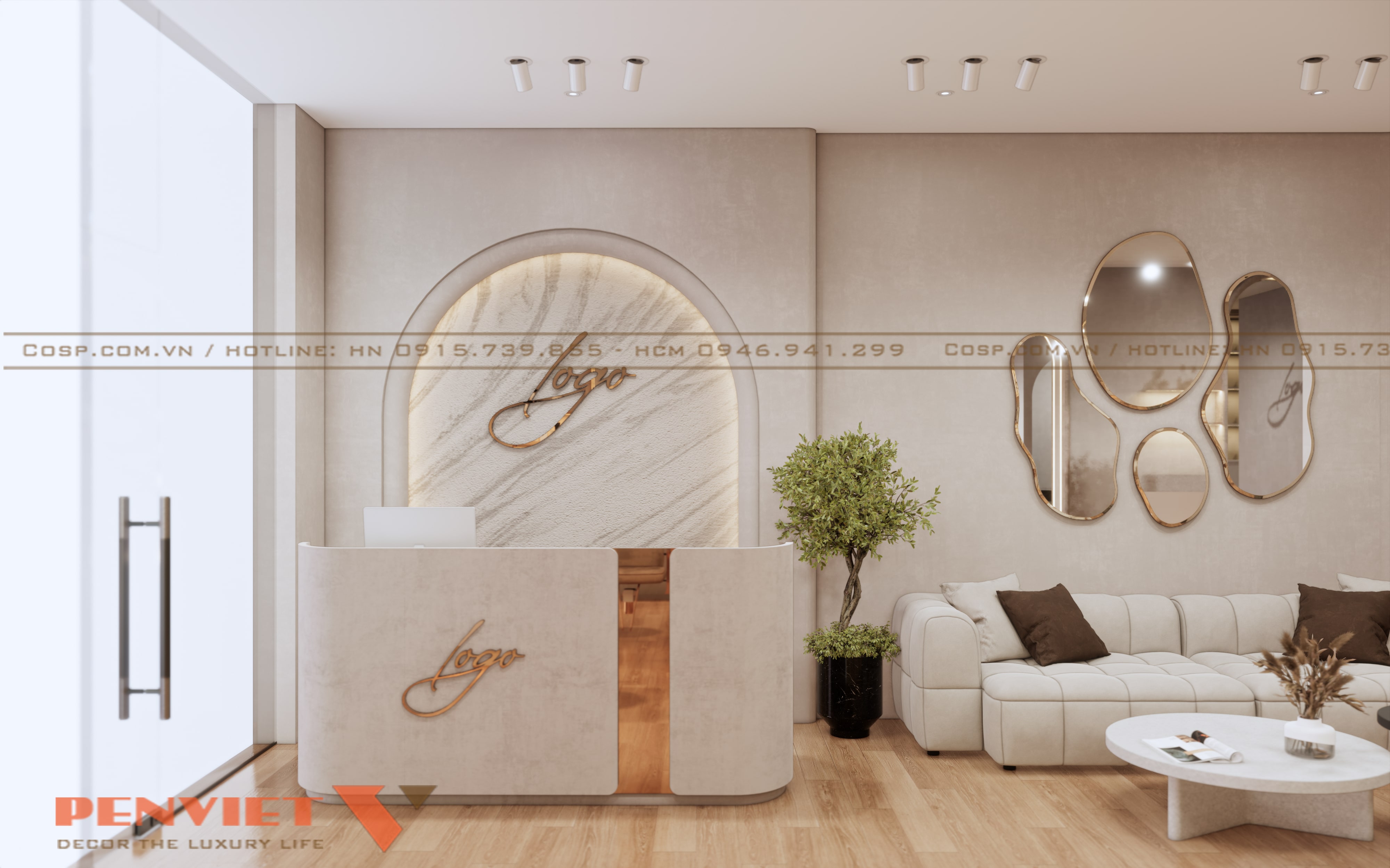Ngay từ lối vào, không gian lễ tân đã gây ấn tượng mạnh với thiết kế hiện đại và tinh tế. Quầy lễ tân được bo cong nhẹ nhàng, kết hợp màu trắng thanh lịch với logo gắn nổi bằng kim loại ánh đồng tạo nên điểm nhấn nhận diện thương hiệu nổi bật. Bề mặt quầy được xử lý mịn màng, sạch sẽ, mang lại cảm giác chuyên nghiệp và đẳng cấp.