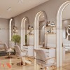 Khu vực chính của salon là nơi diễn ra các dịch vụ cắt, uốn, nhuộm và tạo kiểu tóc được thiết kế theo lối bố trí hàng ngang dọc, tạo luồng di chuyển mạch lạc và thuận tiện. Dãy ghế làm tóc bố trí song song sát tường, mỗi vị trí đều được thiết kế đồng bộ, với tấm gương lớn đặt trong khung vòm đèn LED âm, vừa tạo hiệu ứng ánh sáng lung linh vừa giúp không gian rộng mở hơn.