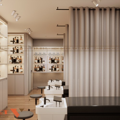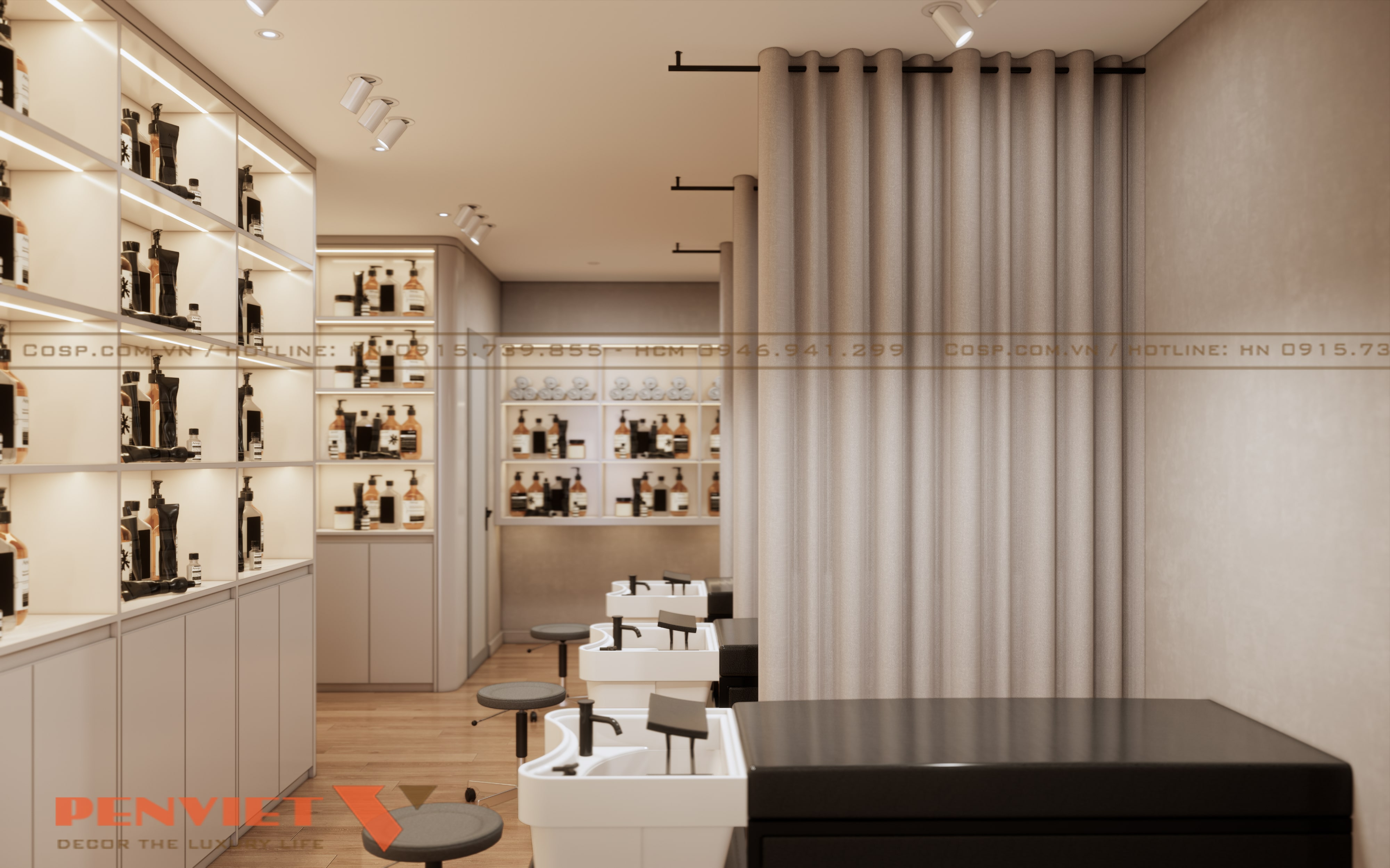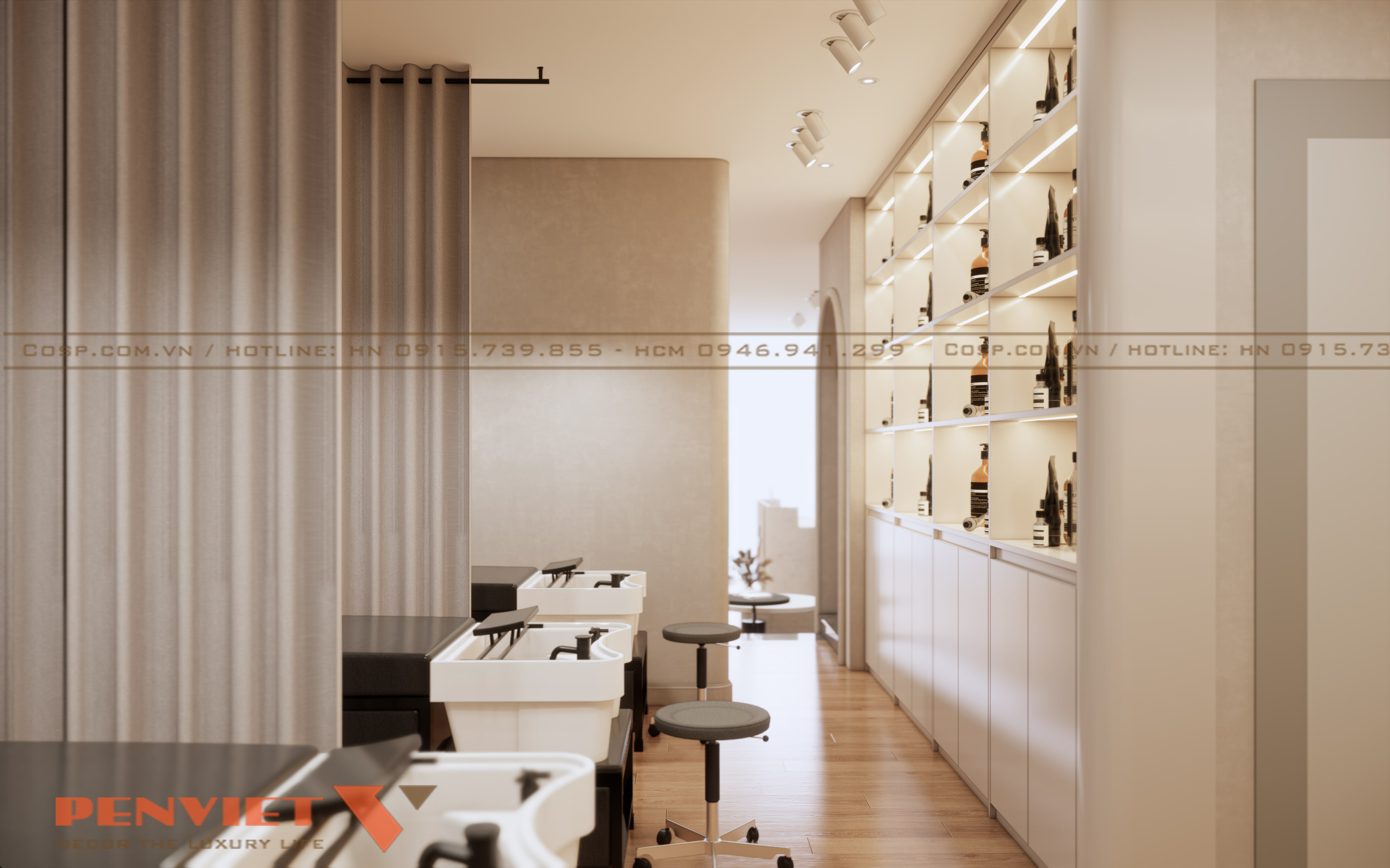 Ánh sáng tại đây được bố trí dịu nhẹ, tập trung chủ yếu từ trần với các cụm đèn LED ánh vàng trung tính. Trên các kệ tường là các sản phẩm chăm sóc tóc cao cấp, khăn gấp gọn gàng theo phong cách spa chuyên nghiệp.