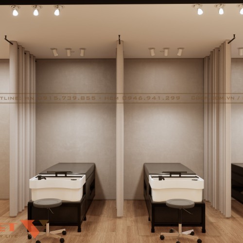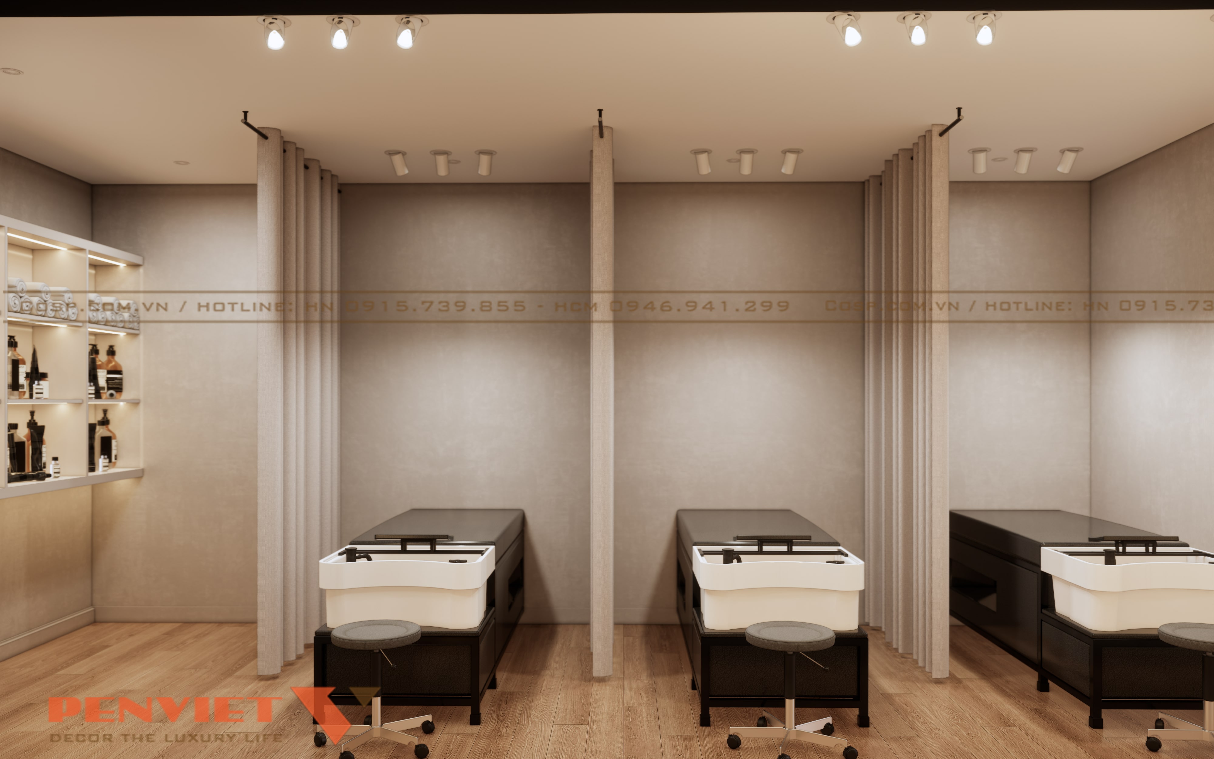 Không gian dịch vụ gội đầu và dưỡng tóc phía sau được thiết kế thành các phòng nhỏ tách biệt, mang tính cá nhân hóa cao. Mỗi khu vực được phân chia bằng rèm vải màu nude thanh lịch, vừa đảm bảo sự riêng tư vừa dễ dàng đóng mở linh hoạt theo nhu cầu.