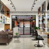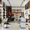 Hệ nội thất phía bên trong cửa hàng được phân chia thành một bên là khu vực dịch vụ cắt tóc, bên còn lại là quầy thu ngân và bàn trà đón khách. Bộ bàn thu ngân và chiếc tủ phía sau quầy lễ tân được làm bằng gỗ MDF chống ẩm phủ Melamine dày 17mm. Chiếc tủ được thiết kế với phần hậu Alu, hộc tủ cánh mở và bản lề giảm chấn.