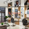 Để trang trí co thiet ke cua hang này, phần trần nhà dưới gác xép được ốp gỗ nhựa Planwood. Những bức tranh trang trí với khung gỗ và tranh in lụa được gắn thêm trên các trán của tủ kệ vừa để trang trí, vừa để quảng bá một số mẫu tóc nam để khách hàng lựa chọn.