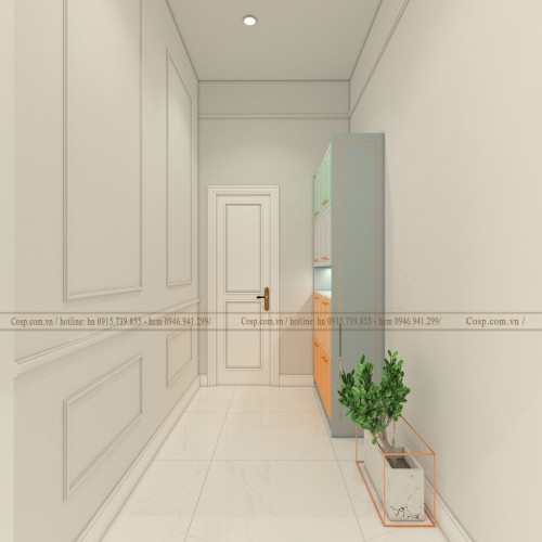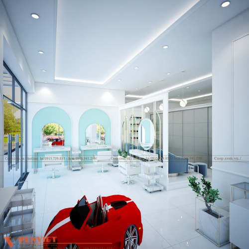 Thiết kế nội thất salon phong cách hiện đại sử dụng tông màu trắng và xanh nhẹ nhàng lịch sự. Sử dụng màu sắc đơn giản tạo nên một tổng thể ưa nhìn, hiện đại và trẻ trung. Nội thất theo phong cách hiện đại được thiết kế đơn giản nhưng được cải tạo phần phào chỉ trần và tường tạo nên sự tinh tế từng đường nét.