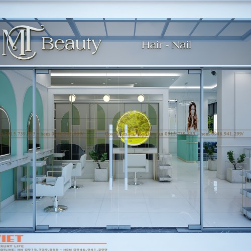 Thiết kế mặt tiền salon tóc được chú trọng đầu tư thiết kế để có thể hút người đi đường. Mặt tiền salon MT Beauty lựa chọn tông màu tươi sáng và thanh lịch. Biển hiệu thiết kế đơn giản không quá cầu kỳ nổi bật lên thương hiệu. Cửa kính cường lực bền chắc mang đến nguồn ánh sáng tự nhiên cho salon tóc.