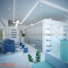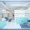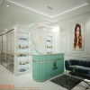 Khu vực tiếp đón và chờ đợi dành cho khách hàng đặt trước quầy thu ngăn. Khu vực này sử dụng ghế sofa màu xanh nhẹ nhàng nổi bật trên lát gạch sàn màu trắng đi cùng bàn trà nhỏ xinh. Quầy thu ngân thiết kế kiểu dáng hiện đại gỗ mdf phủ sơn 2k và được nẹp inox khiến không gian sang chảnh hơn.
