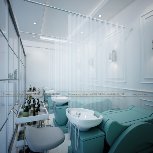 Bố cục nội thất salon tóc với các không gian làm nail và gội đầu song song theo chiều dọc tạo chiều sâu cho không gian. Khoảng cách giữa các khu vực làm đẹp hợp lý và vừa đủ để tạo sự thoải mái di chuyển cho cả các nhân viên và khách hàng tại salon.