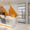 Quầy thu ngân được bố trí phía trong. Thiết kế quầy thu ngân sang trọng và hiện đại với tone màu trắng sáng họa tiết vân mây. Kết hợp với bộ logo bằng chất liệu mica nổi bật. Phía sau quầy thu ngân được tận dụng để đồ của nhân viên bằng việc sử dụng gỗ cánh lùa.