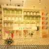 Hai bên tường của shop được thiết kế với kệ trưng bày nhiều kiểu dáng khác nhau. Bên trái nhìn từ cửa vào thì kệ được thiết kế hoàn toàn bằng gỗ MDF phun sơn 07 màu trắng. Vì là tường nhà có màu trắng cho nên kệ trưng bày cũng phải là màu trắng để phù hợp với màu không gian.