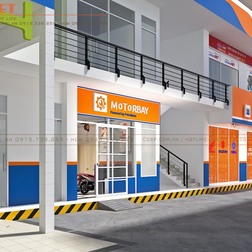 Đặc điểm về vị trí khiến cho cửa hàng có lợi thế khi sở hữu tới 2 mặt tiền. Điều này được các kiến trúc sư PenViet phát huy khi sử dụng lồng ghép những gam màu theo chủ đề một cách khéo léo nhằm mang tới diện mạo nổi bật cho cửa tiệm. Chủ đầu tư rất hài lòng với ý tưởng setup mặt tiền thu hút trong mẫu thiết kế trung tâm bảo dưỡng và sửa chữa xe máy Motorbay.