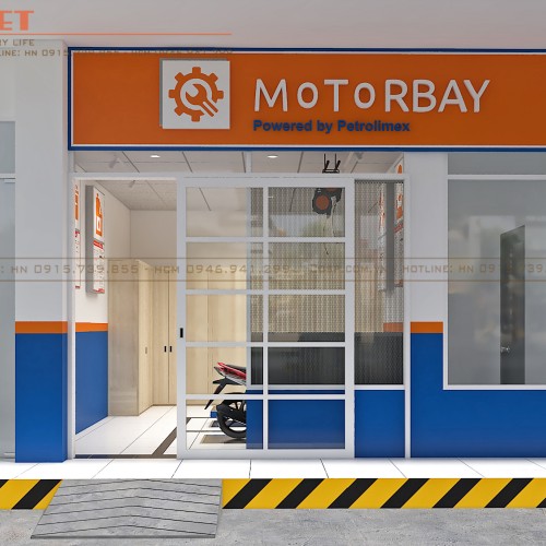 Mẫu thiết kế trung tâm bảo dưỡng, sửa chữa xe máy Motorbay cũng được PenViet tư vấn lắp đặt các mái hiên di động vừa để mở rộng thêm diện tích sử dụng cho cửa tiệm vừa là một giải pháp đối phó với thời tiết nắng nóng của thành phố Hồ Chí Minh. Phương án này được chủ đầu tư hết sức đồng tình.