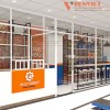 Khu vực kho sử dụng hệ tủ bằng gỗ MDF chống ẩm phủ Melamine kết hợp khung sắt sơn để tối ưu không gian lưu trữ. Cách thức lựa chọn vật liệu được PenViet tư vấn nhằm đảm bảo khả năng chịu lực, duy trì tuổi thọ và tính thẩm mỹ cho nội thất.