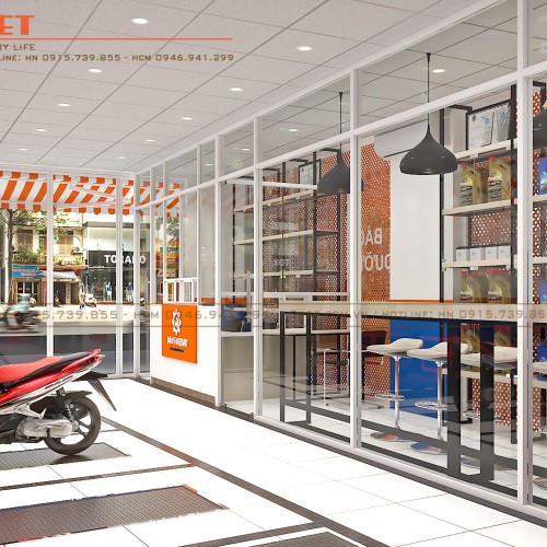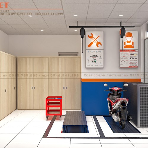 Dựa trên nhu cầu và nguyện vọng của chủ đầu tư, chúng tôi tư vấn setup cửa tiệm mang phong cách hiện đại để phù hợp với đặc điểm ngành nghề. Điều này cũng sẽ giúp tạo dựng diện mạo chuyên nghiệp, phong cách cho trung tâm bảo dưỡng, sửa chữa xe máy này.