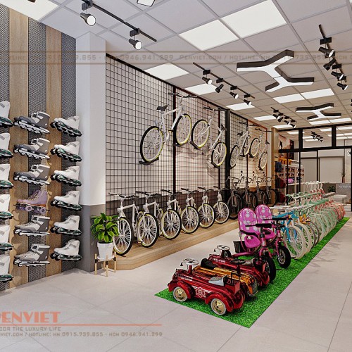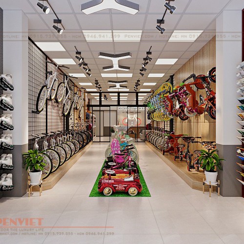 Trung tâm cửa tiệm, PenViet còn decor vị trí trưng bày những chiếc sản phẩm như ôtô, xe đạp dành cho trẻ em với nhiều màu sắc nổi bật không những kích thích sự tò mò, thu hút các bạn nhỏ mà còn tạo ra những lối đi giúp nhân viên cũng như khách hàng thuận tiện di chuyển.