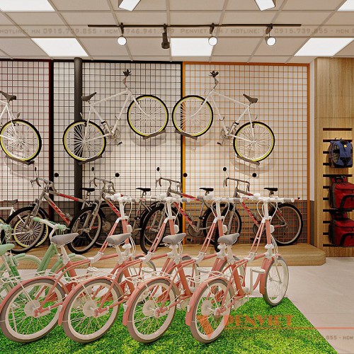 Đi sâu vào bên trong của tiệm, PenViet setup khu vực trưng bày sản phẩm xe người lớn bằng khung sắt sơn tĩnh điện kết hợp bục bằng gỗ MDF lõi xanh cốt Thái phủ melamine sát tường, điều này vừa tiết kiệm diện tích, vừa giúp cửa hàng thêm ngăn nắp gọn gàng. Qua đây cũng cho thấy kinh nghiệm của kiến trúc sư trong lĩnh vực thiết kế cửa hàng xe đạp.