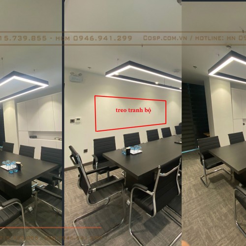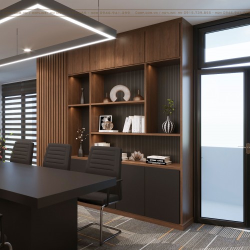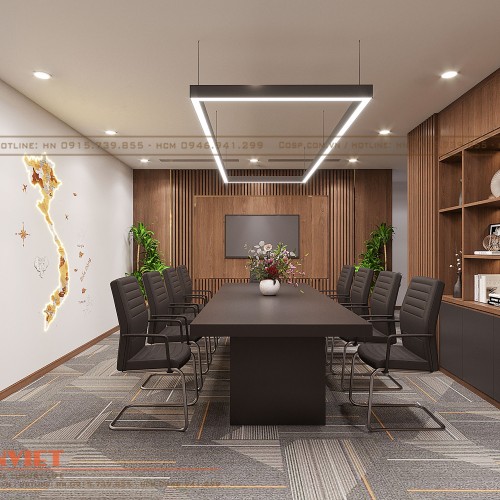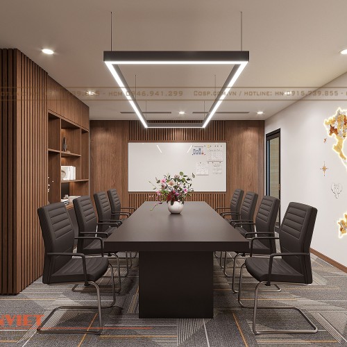 Bước vào không gian phòng họp, chúng ta sẽ cảm nhận ngay được sự sang trọng, lịch sự và trang nghiêm. Tại đây, nội thất được tinh giản, chỉ sử dụng máy chiếu, bàn ghế và hệ tủ sát tường phục vụ nhu cầu sử dụng của khách hàng. Điểm nhấn của không gian này chính là những vách trang trí tạo sự chú ý với mọi người.