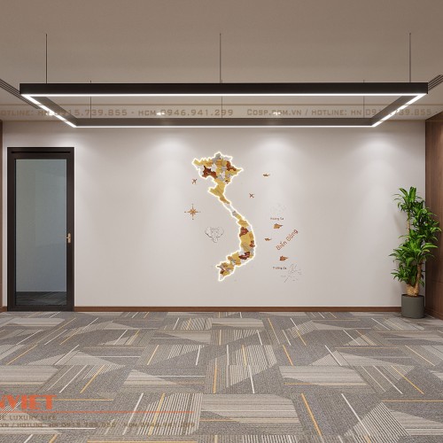 Để trang trí cho không gian phòng họp, PenViet đã thiết kế một bản đồ Việt Nam phát sáng nhằm tạo điểm nhấn cho căn phòng. Bản đồ này được làm từ gỗ thông tấm và phủ keo 2 mặt để gắn tường.