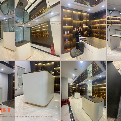 Với không gian hạn chế, PenViet đã tận dụng triệt để không gian sao cho căn phòng vừa trưng bày được nhiều sản phẩm, lại vừa tạo được cảm giác thông thoáng, rộng rãi. Cụ thể là chúng tôi đã bố trí và sắp xếp hệ tủ sát tường bằng gỗ MDF cốt xanh chống ẩm phủ melamine kết hợp các đợt gỗ, cắt CNC họa tiết được áp dụng cho không gian. Cùng với đó, chúng tôi cũng sử dụng thêm thanh ray sắt sơn tĩnh điện để trưng bày các mặt hàng được bắt mắt hơn.