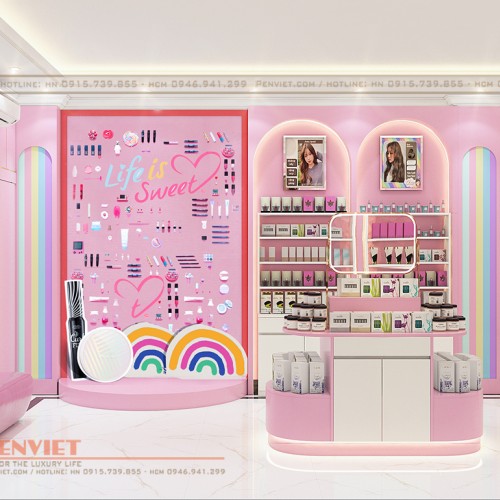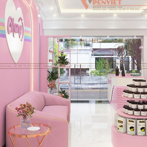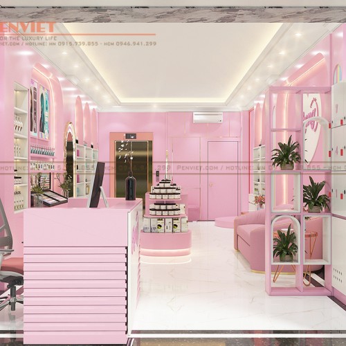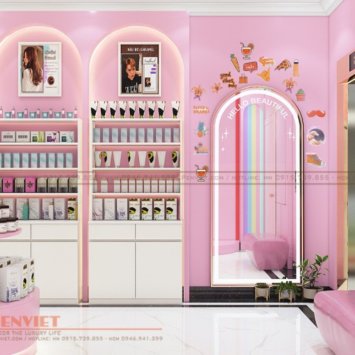Chúng tôi đã mang tới một cửa hàng kinh doanh thuốc làm tóc vô cùng đáng yêu và nữ tính. Toàn bộ không gian cửa tiệm được sử dụng màu hồng kết hợp với trắng bởi những sắc độ khác nhau vô cùng bắt mắt. Điều này mang lại cảm giác dịu nhẹ, thoải mái dành cho khách hàng khi ghé tới đây.