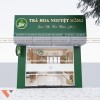 Mặt tiền thiết kế cửa hàng trà hoa Nguyệt Hồng gây ấn tượng mạnh với người nhìn. Bảng hiệu mặt tiền sử dụng tông màu xanh lá cây chủ đạo gợi nhắc đến sự tươi mát, thiên nhiên và sự an lành của sản phẩm trà thảo mộc. Logo hình tách trà cách điệu màu trắng nổi bật trên nền tròn xanh, kết hợp cùng dòng chữ “Trà Hoa Nguyệt Hồng” dễ nhìn và tạo cảm giác tin cậy.