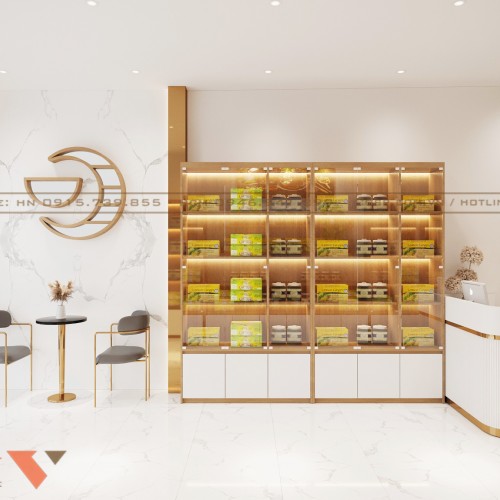 Hai bên tường chính là hệ tủ trưng bày sản phẩm làm từ chất liệu gỗ công nghiệp MDF cốt xanh màu nâu sáng, kết hợp kính trong suốt giúp khách hàng dễ dàng quan sát sản phẩm. Tủ được chia thành nhiều ngăn nhỏ, bố trí khoa học theo từng dòng sản phẩm trà túi lọc, trà gói thảo dược …