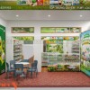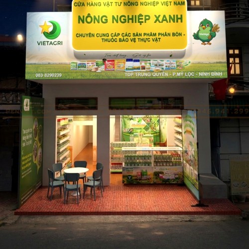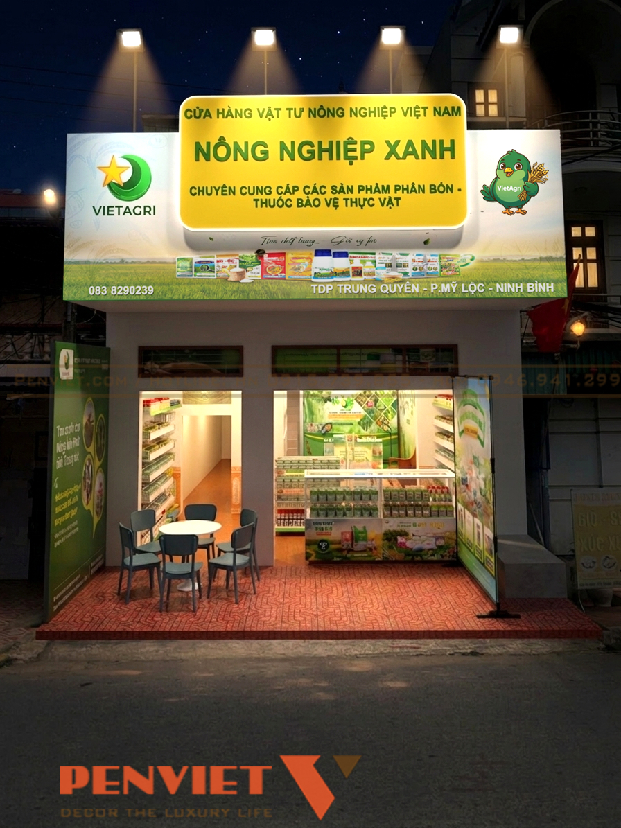 Thiết kế mặt tiền sử dụng tông xanh vàng làm chủ đạo. Màu sắc gợi liên tưởng trực tiếp đến nông nghiệp và sự phát triển bền vững. Biển hiệu lớn, chữ rõ ràng, dễ nhìn từ xa giúp cửa hàng nổi bật trên tuyến phố.