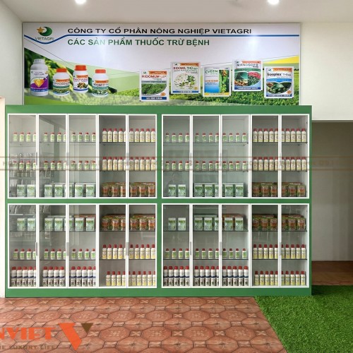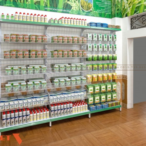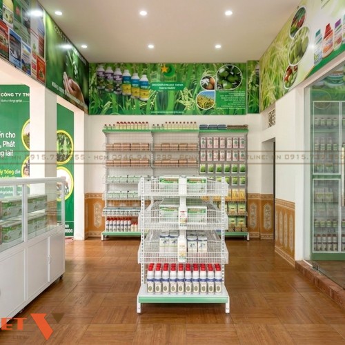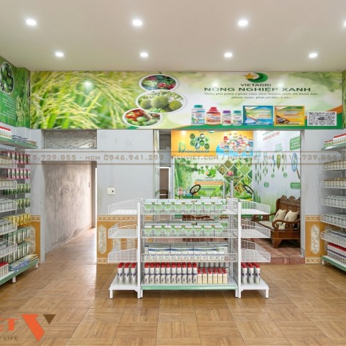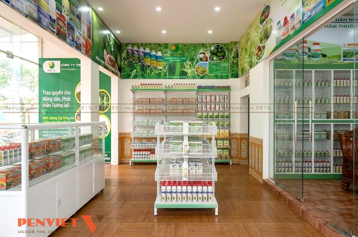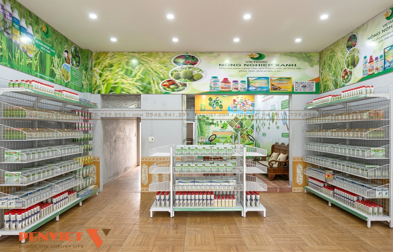 Ánh sáng trần bố trí đều, không tạo vùng tối. Điều này rất quan trọng với cửa hàng vật tư nông nghiệp, giúp khách nhìn rõ nhãn mác sản phẩm.