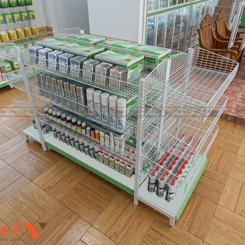 Kệ trưng bày sử dụng dạng lưới kim loại sơn trắng. Thiết kế này giúp sản phẩm nổi bật hơn và dễ quan sát. Đồng thời tạo cảm giác sạch sẽ, gọn gàng.