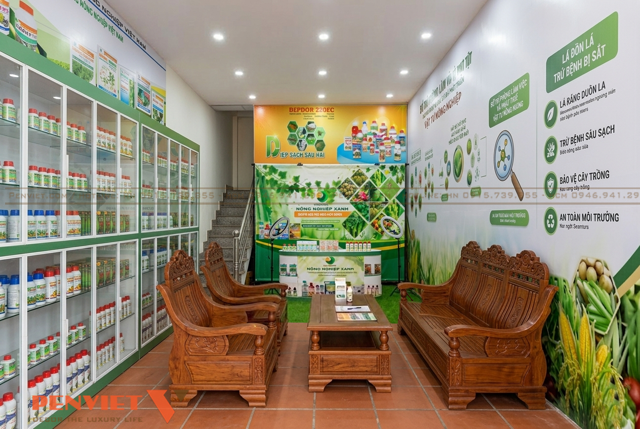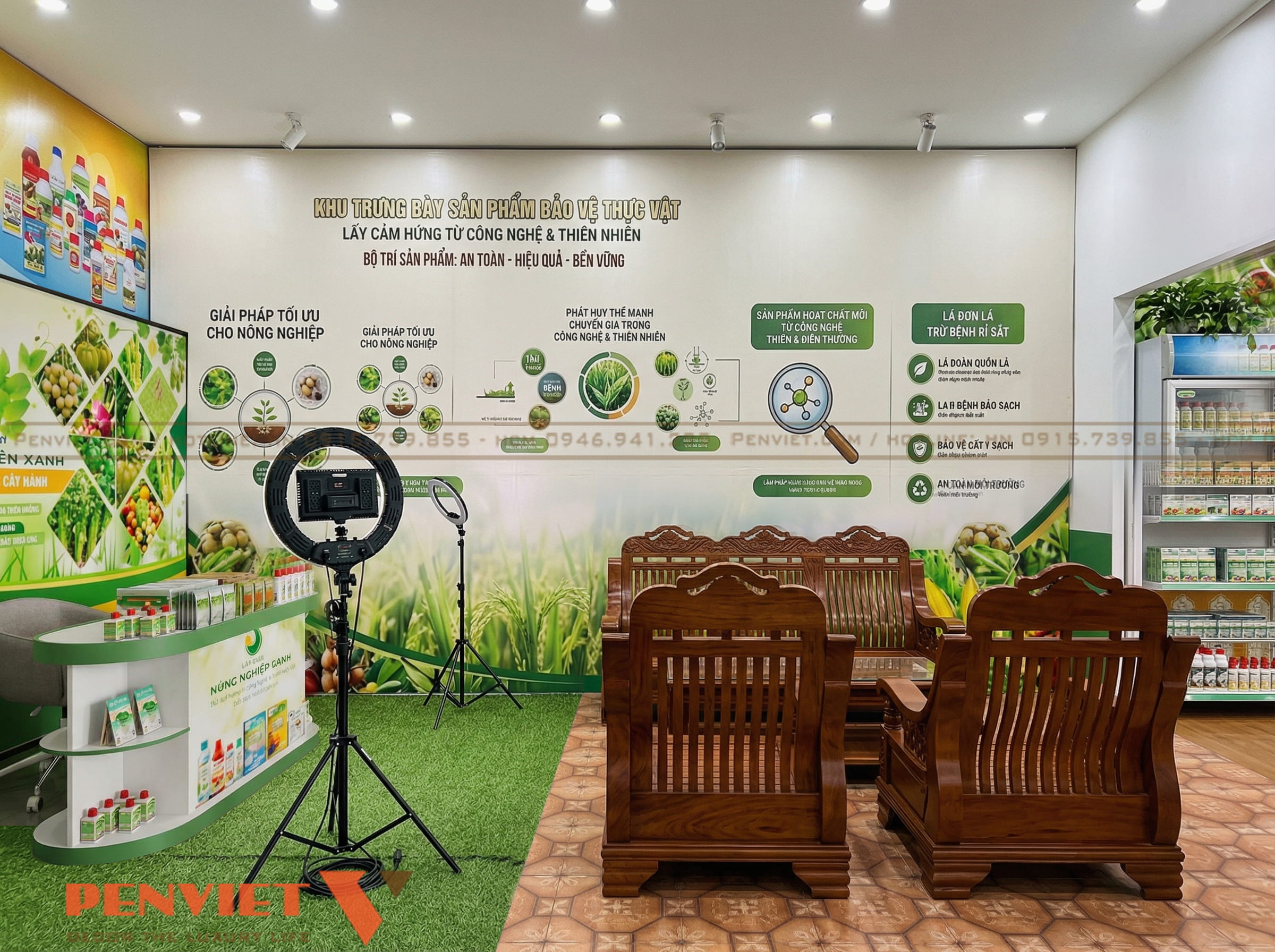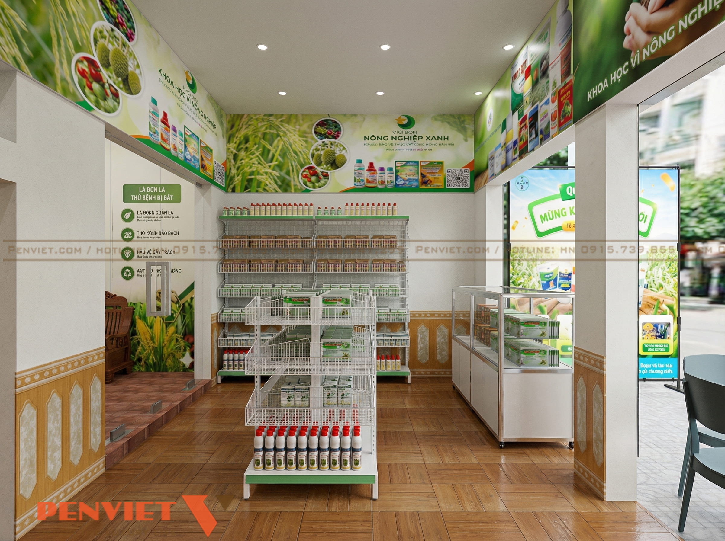 Phía cuối cửa hàng là khu trưng bày nổi bật kết hợp tư vấn. Tường được in hình ảnh nông nghiệp sinh động, tạo điểm nhấn trực quan. Đây cũng là khu vực giúp tăng độ tin tưởng với khách hàng.