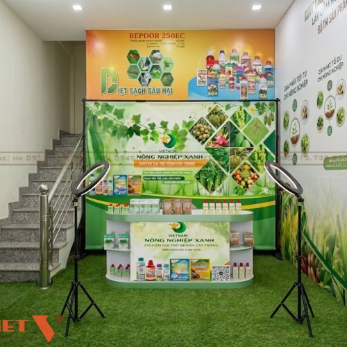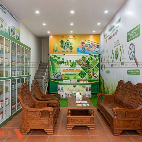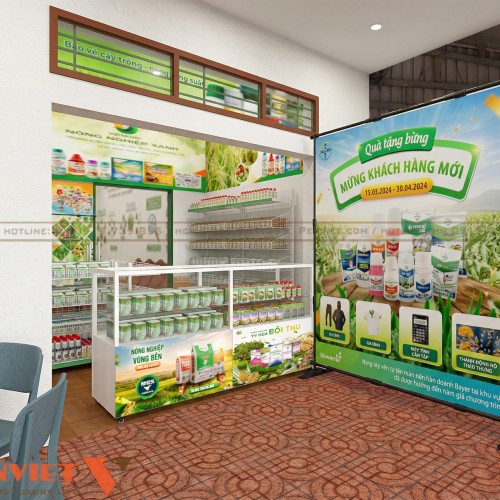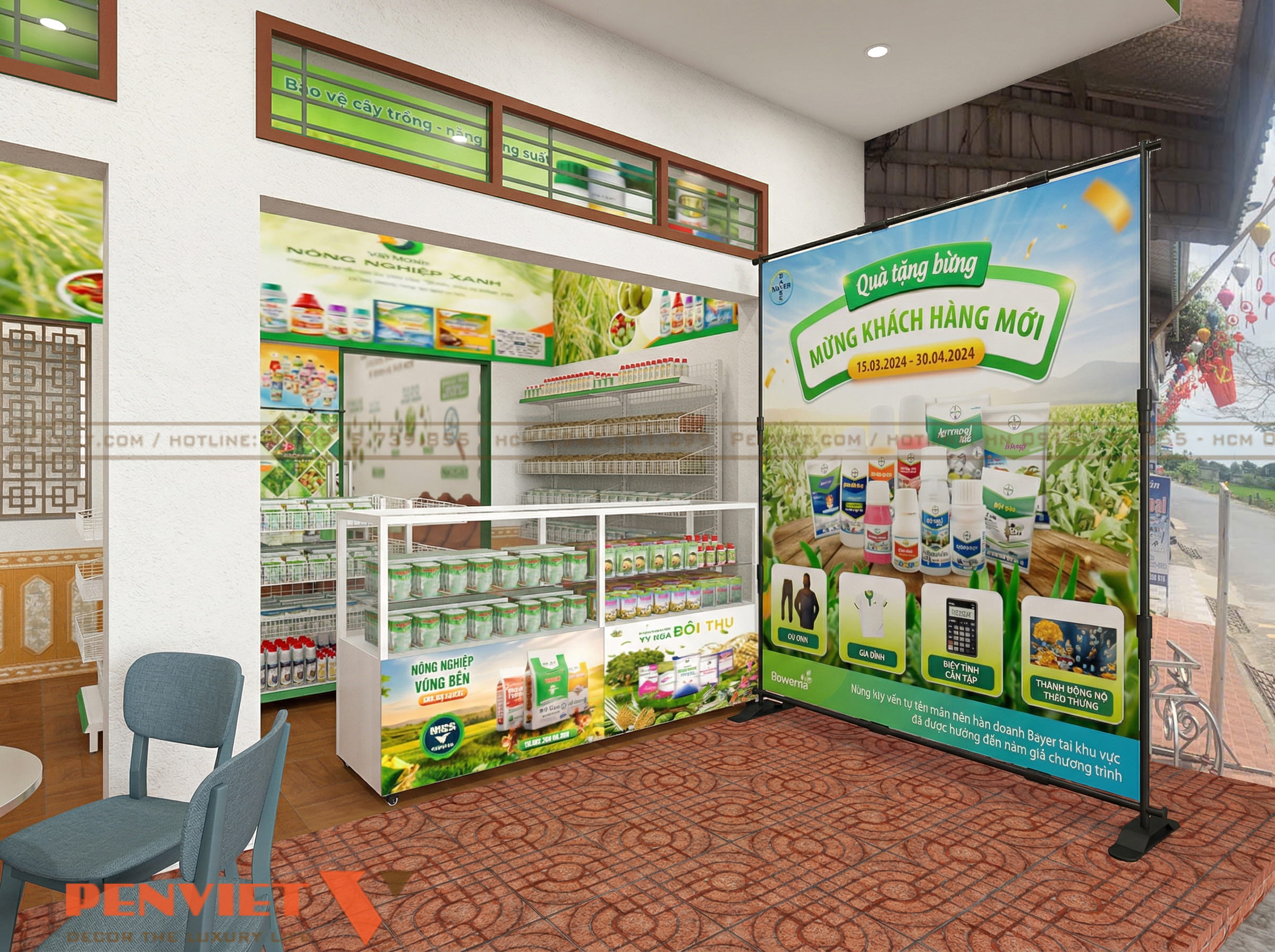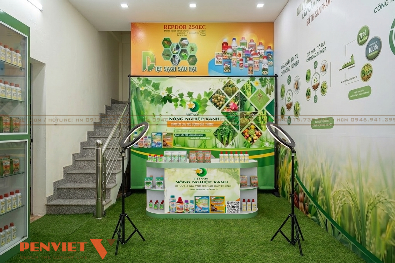 Phía cuối cửa hàng là khu trưng bày nổi bật kết hợp tư vấn. Tường được in hình ảnh nông nghiệp sinh động, tạo điểm nhấn trực quan. Đây cũng là khu vực giúp tăng độ tin tưởng với khách hàng.