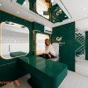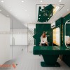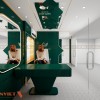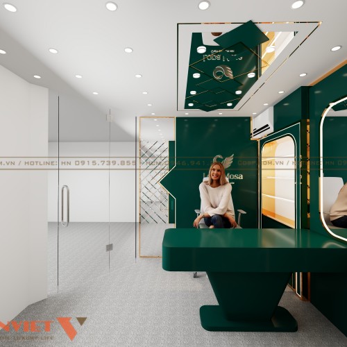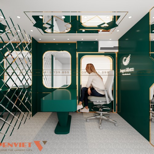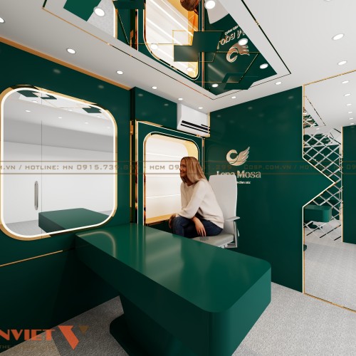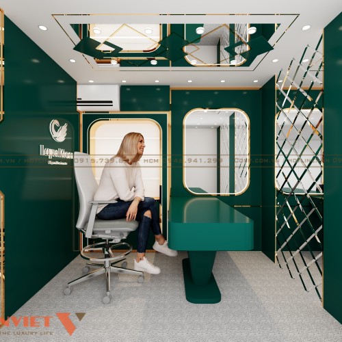Màu sắc chủ đạo của không gian là xanh lá cây đậm thời thượng và không lỗi mốt theo thời gian. Bên cạnh đó là hệ thống đèn LED viền được tích hợp trong các khung tường và vách ngăn đảm bảo đủ sáng để livestream. Đèn âm trần với tông ánh sáng trắng giúp giảm bóng tối để làm nổi bật người dẫn chương trình trong khung hình. Sự kết hợp ánh sáng phản chiếu từ bề mặt gương và kim loại sẽ tăng hiệu ứng lung linh, hiện đại.
