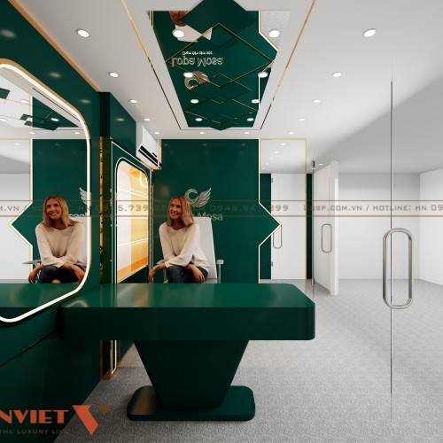 Vách tường có logo thương hiệu "Hopea Massa" tạo điểm nhấn nổi bật. Bên cạnh đó là ô vuông tráng gương và khung nẹp viền inox vàng gold ánh vàng tạo cảm giác không gian mở rộng, tăng tính thẩm mỹ.
