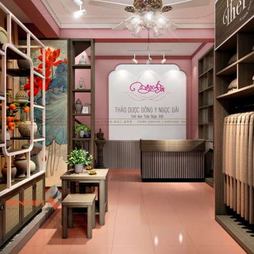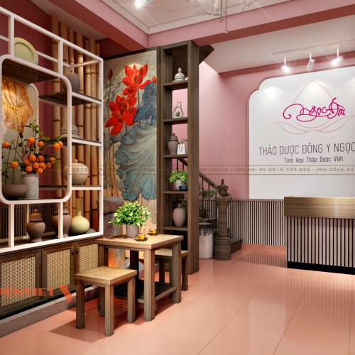 Bên cạnh khu vực bếp từ thiện là không gian trưng bày và bán Pháp phục đi lễ cùng với các loại trà thảo dược Đông y. Nơi đây được thiết kế với phong cách thanh lịch, tinh tế vừa có sự yên bình, vừa giúp khách hàng tĩnh tại khi bước vào. Quầy lễ tân hỗ trợ tư vấn khách với chất liệu gỗ mộc mạc. Vách logo thương hiệu với bộ chữ " Ngọc Đài" cách điệu tạo điểm nhấn thu hút.
