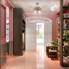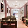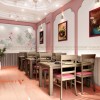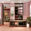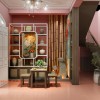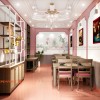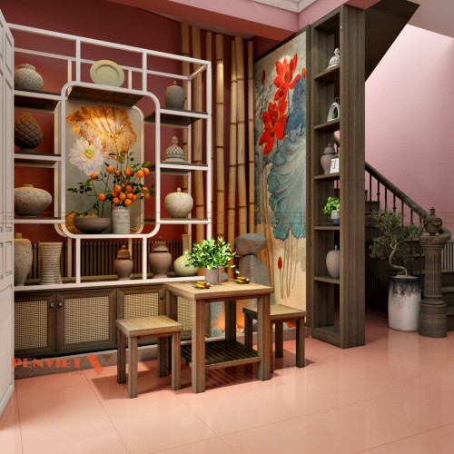Màu sắc chủ đạo có sự đồng điệu khu vực bếp ăn với màu trắng, hồng nhạt, nâu gỗ. Bên cạnh đó là sự kết hợp các bức tranh nghệ thuật và cây xanh trang trí rất tươi mới, hài hòa. Các bức tường được trang trí với họa tiết hoa sen, hoa súng là biểu tượng truyền thống của sự thanh cao và tinh khiết trong văn hóa Phật giáo.